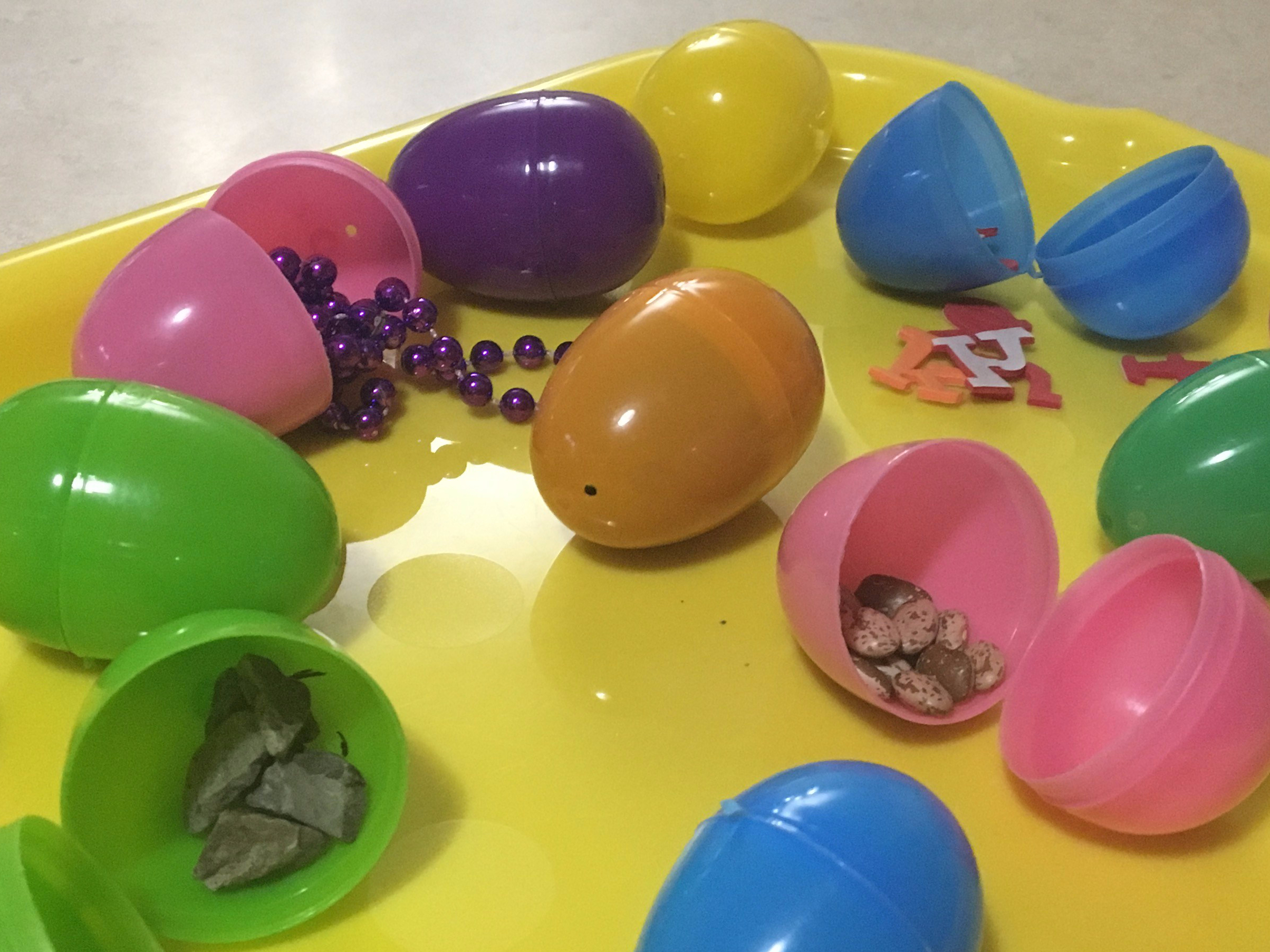 Finding noisy items to put in the eggs was difficult. I avoided food and toys because she gets sidetracked and just wants to eat or play with the toy. I filled the eggs with coins, beans, foam stickers, beaded necklace, gravel, and rice. Other ideas you could try include paper clips, buttons, or caps from water bottles or squeeze pouches.