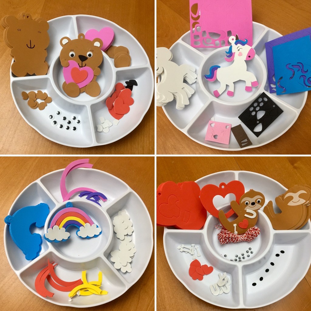 It took a little time to set up her craft trays, but in the end she could do the crafts mostly independently after we did one together. (She does have trouble removing the sticker backing on the eyes, so I help her with that.)