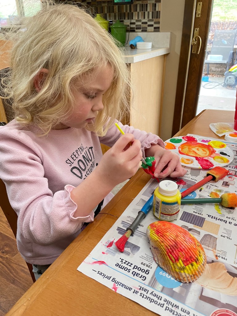 My older daughter took shell painting a bit more seriously. She was inspired by this really cool YouTube video by Moriah Elizabeth (check it out here). Our shells did not turn out as nice as Moriah’s, but it was fun trying to imitate some of her creations! I love when my kids are inspired to try something new, like a Moriah’s painting techniques.